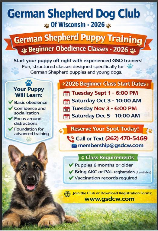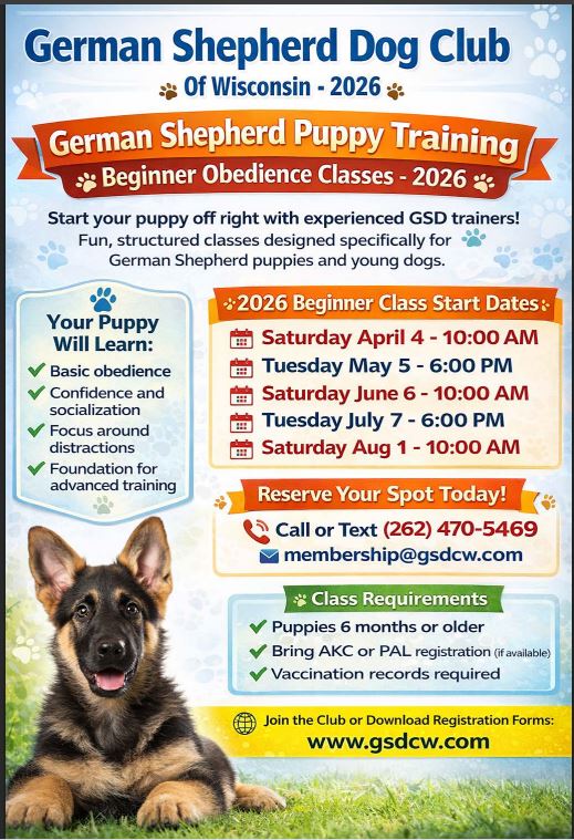 GSDCW NEWS See what's new and what's happening. Beginners April-August Beginners Sept-December Updated 2026 Training Schedule Reactive Dog Class Tracking Class How to get your STAR Cert Weather Policy